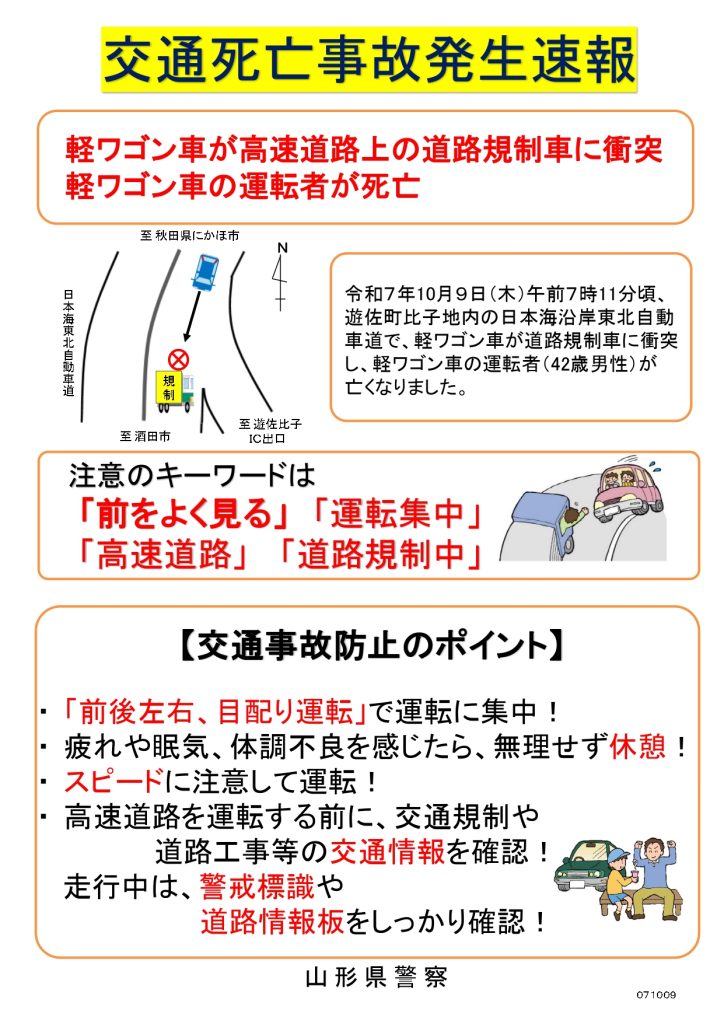 令和7年10月9日(木)午前7時11分頃、遊佐町比子地内の日本海沿岸東北自動車道で、軽ワゴン車が道路規制車に衝突し、軽ワゴン車の運転者(42歳男性)が亡くなりました。