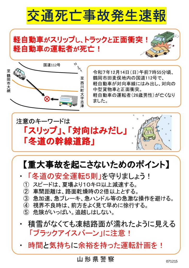令和7年12月14日(日)午前7時55分頃、鶴岡市田麦俣地内の国道112号で、軽自動車が対向車線にはみ出し、対向の中型貨物と正面衝突。軽自動車の運転者(安管選任事業所従業員の26歳男性)が亡くなりました。