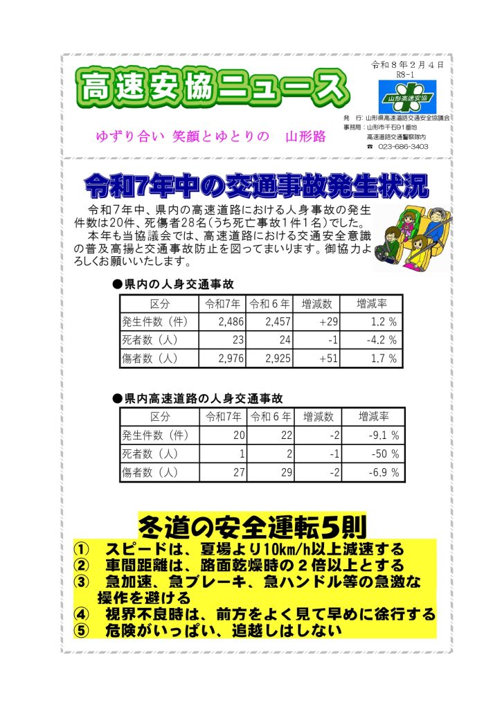 山形県高速道路交通安全協議会から、高速安協ニュース「令和7年中の交通事故発生状況」が発行されました。高速道路における交通事故防止指導の参考としてください。
