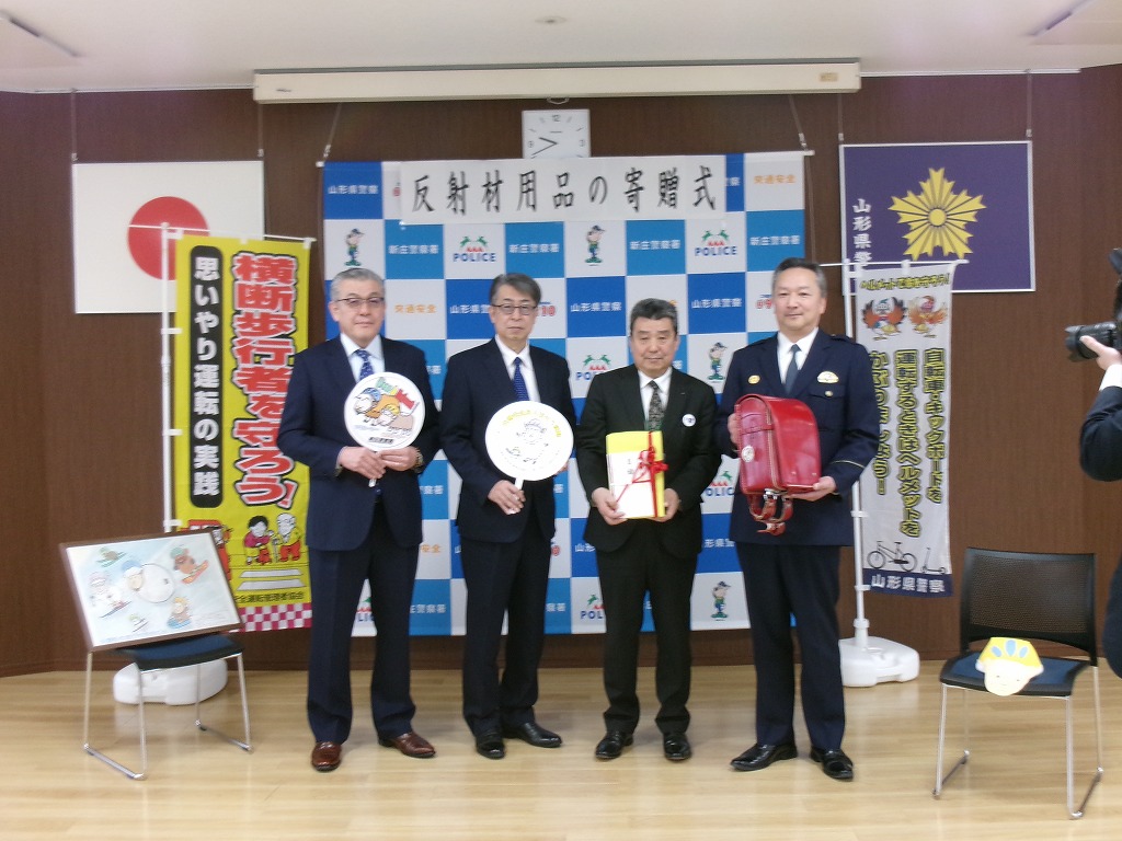 寄贈した反射材用品には、やまがた自転車ヘルメット着用推進キャラクター「マモルーシー」と「カブルーシー」がデザインされており、新庄警察署管内の各自治体を通して新1年生全員へ配布される予定です。