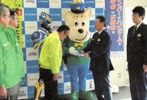 寄贈式後は新庄市内の商業施設敷地内において、ご当地ヒーロー「未来創造戦士ユメリオン」・県警マスコット「カモンくん」と共に街頭啓発活動を実施し、夜光反射材を配布しながら交通事故防止を呼び掛けました。