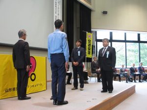 令和7年10月22日(水)山形国際交流プラザ・ビッグウイングにおいて、山形県交通安全対策協議会主催「第64回山形県交通安全県民大会」が開催されました。大会には表彰受賞者・来賓等約250名が出席し、山形県交通安全対策協議会長(県知事)表彰(優良安全運転管理者10名)で山形地区・株式会社ジョインの加藤潤様、山形県警察本部長・山形県安全運転管理者協会長連名表彰(優良安全運転管理者45名)で上山地区・株式会社月岡ホテルの山口知洋、同表彰(交通安全優良事業所10事業所)で村山地区・株式会社矢萩土建(代表取締役社長矢萩翔一)様がそれぞれ代表で受賞されました。